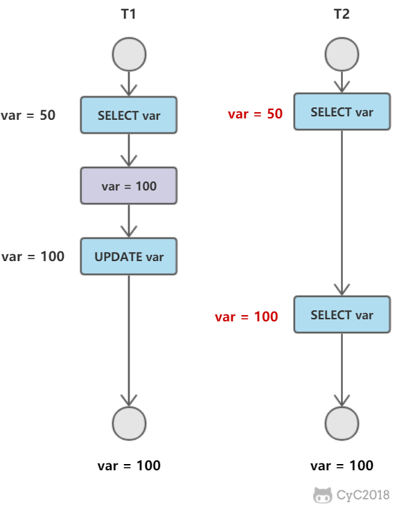 把没有对一个数据行做修改的事务称为 T,T 所要读取的数据行快照的创建版本号必须小于 T 的版本号,因为如果大于或者等于 T 的版本号,那么表示该数据行快照是其它事务的最新修改,因此不能去读取它。除此之外,T 所要读取的数据行快照的删除版本号必须大于 T 的版本号,因为如果小于等于 T 的版本号,那么表示该数据行快照是已经被删除的,不应该去读取它。