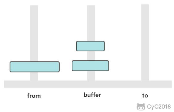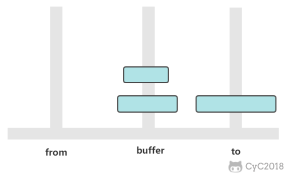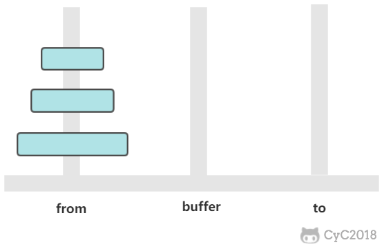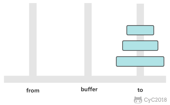 有三个柱子,分别为 from、buffer、to。需要将 from 上的圆盘全部移动到 to 上,并且要保证小圆盘始终在大圆盘上。