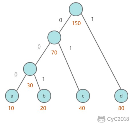 可以将每种字符转换成二进制编码,例如将 a 转换为 00,b 转换为 01,c 转换为 10,d 转换为 11。这是最简单的一种编码方式,没有考虑各个字符的权值(出现频率)。而哈夫曼编码采用了贪心策略,使出现频率最高的字符的编码最短,从而保证整体的编码长度最短。