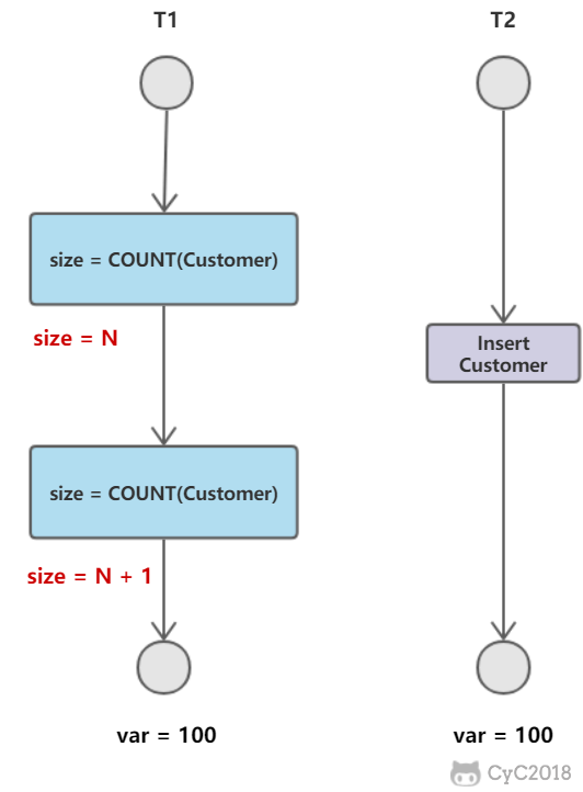 T1 读取某个范围的数据,T2 在这个范围内插入新的数据,T1 再次读取这个范围的数据,此时读取的结果和和第一次读取的结果不同。