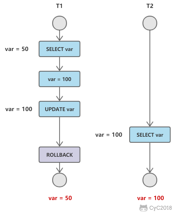 T1 修改一个数据,T2 随后读取这个数据。如果 T1 撤销了这次修改,那么 T2 读取的数据是脏数据。