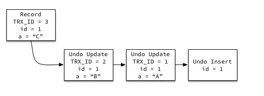 当开始一个事务时,该事务的版本号肯定大于当前所有数据行快照的创建版本号,理解这一点很关键。数据行快照的创建版本号是创建数据行快照时的系统版本号,系统版本号随着创建事务而递增,因此新创建一个事务时,这个事务的系统版本号比之前的系统版本号都大,也就是比所有数据行快照的创建版本号都大。
